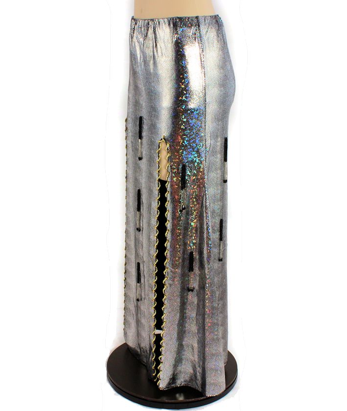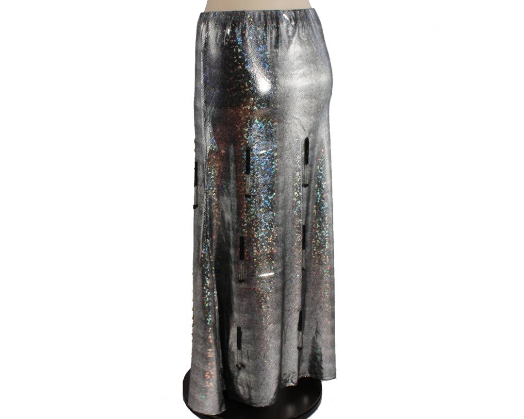 La jupe argenté porte son nom du a des reflets  métalliques dans celle-ci. Jupe a coupe droite et fente de chaque côté, elle est agrémentée de dérorations en perles pendantes qui bougeront avec vos mouvements. Taille élastique